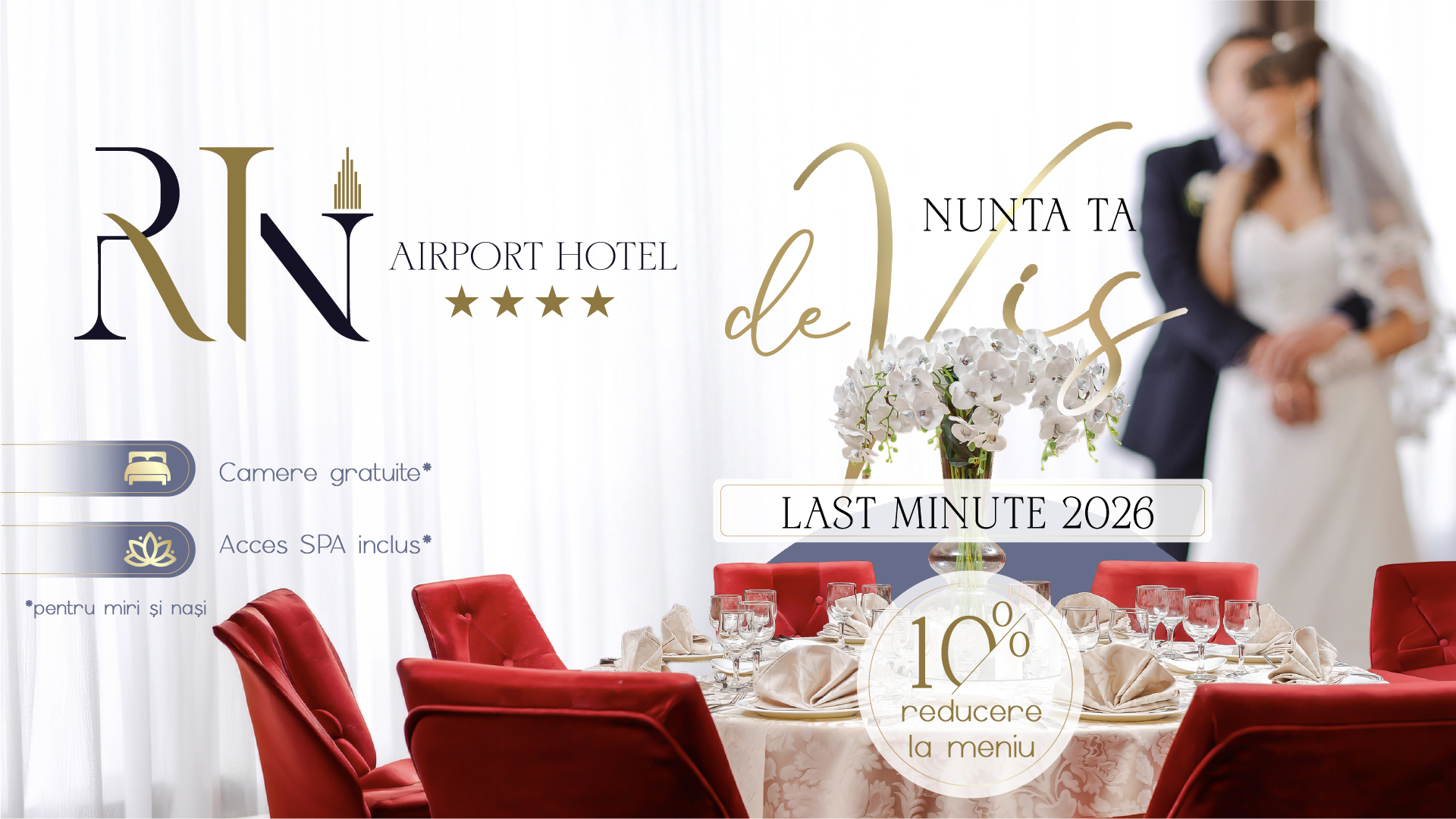 Profită de Oferta Last Minute 2026 și organizează nunta la RIN Airport Hotel. Am pregătit un pachet complet cu beneficii pentru miri și nași.